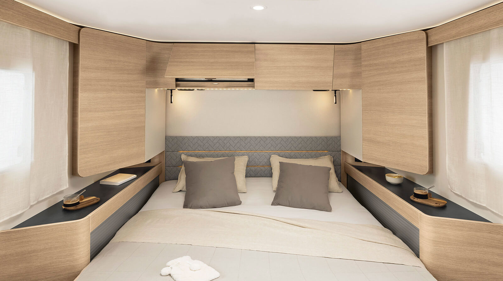 Beleuchtete Ablagefächer am Queensbett mit USB-Anschluss und 12 V-Steckdose